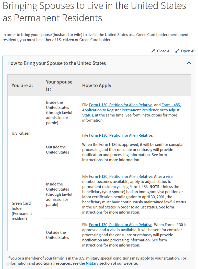 申請者本人が: 配偶者が: 申請方法 米国市民 米国内に滞在中(合法的な入国またはパロール)(※パロール=「仮入国」や「一時的な滞在許可」のこと) I-130フォーム(親族移民申請)とI-485フォーム(永住権申請)を同時に提出。詳細はフォームの説明を参照。 米国外に滞在中 I-130を提出。I-130が承認されると、領事手続きに回され、領事館または大使館から面接通知と手続き情報が提供されます。 グリーンカード保持者(永住者) 米国内に滞在中(合法的な入国またはパロール) I-130を提出。ビザ番号が利用可能になった後、I-485でステータス変更申請。 注:受益者(配偶者)が2001年4月30日以前に移民ビザ申請書または労働証明書を申請中でない限り、永住権を取得するためには、受益者が常に合法的な滞在状態を維持している必要があります。 米国外に滞在中 I-130を提出。I-130が承認されてビザが利用可能になったら、領事手続きに回され、領事館または大使館から面接通知と手続き情報が提供されます。 ご本人またはご家族が米軍に所属している場合は、特別な条件が適用される場合があります。情報やその他の情報源については、USCISのMilitaryセクションをご確認ください。