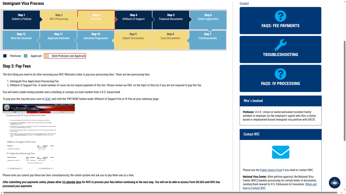 最初のステップであるI-130申請を終え、それが承認されたらステップ2のNVC(ナショナルビザセンター)への移行という段階に進んでいたのが前回までに見ていた部分ですが、続いてはステップ3ですね。